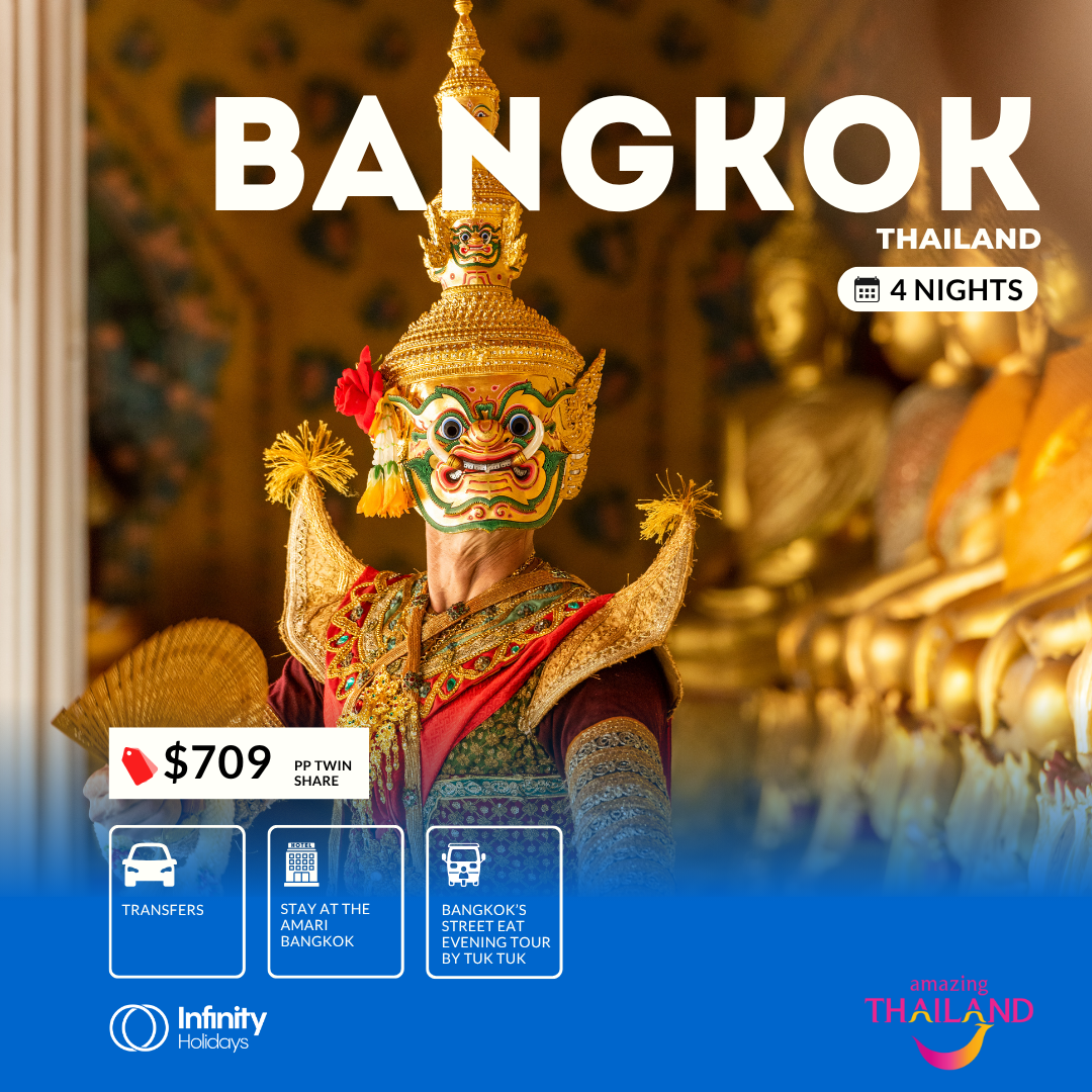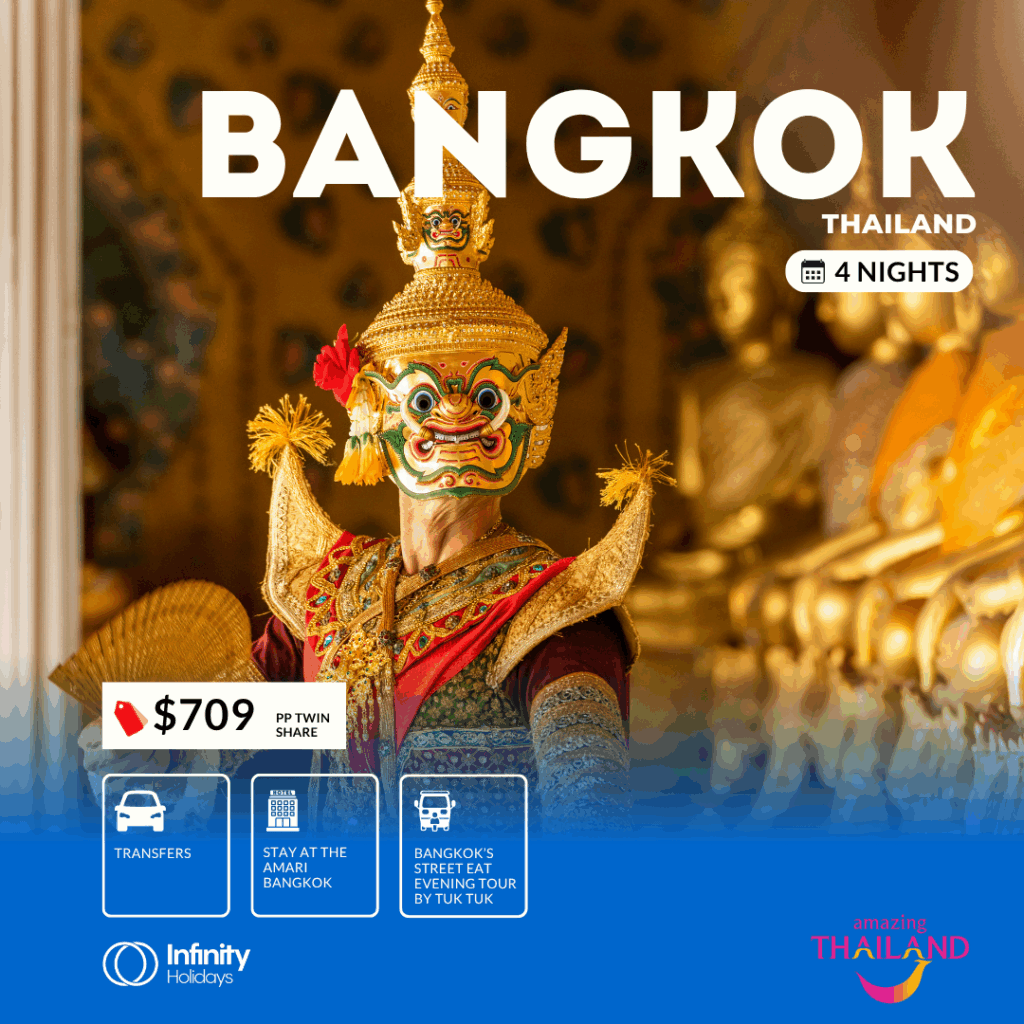 4 nights at the Amari Bangkok, Bangkok’s Street Eat Tour by Tuk Tuk Evening, PLUS airport transfers.