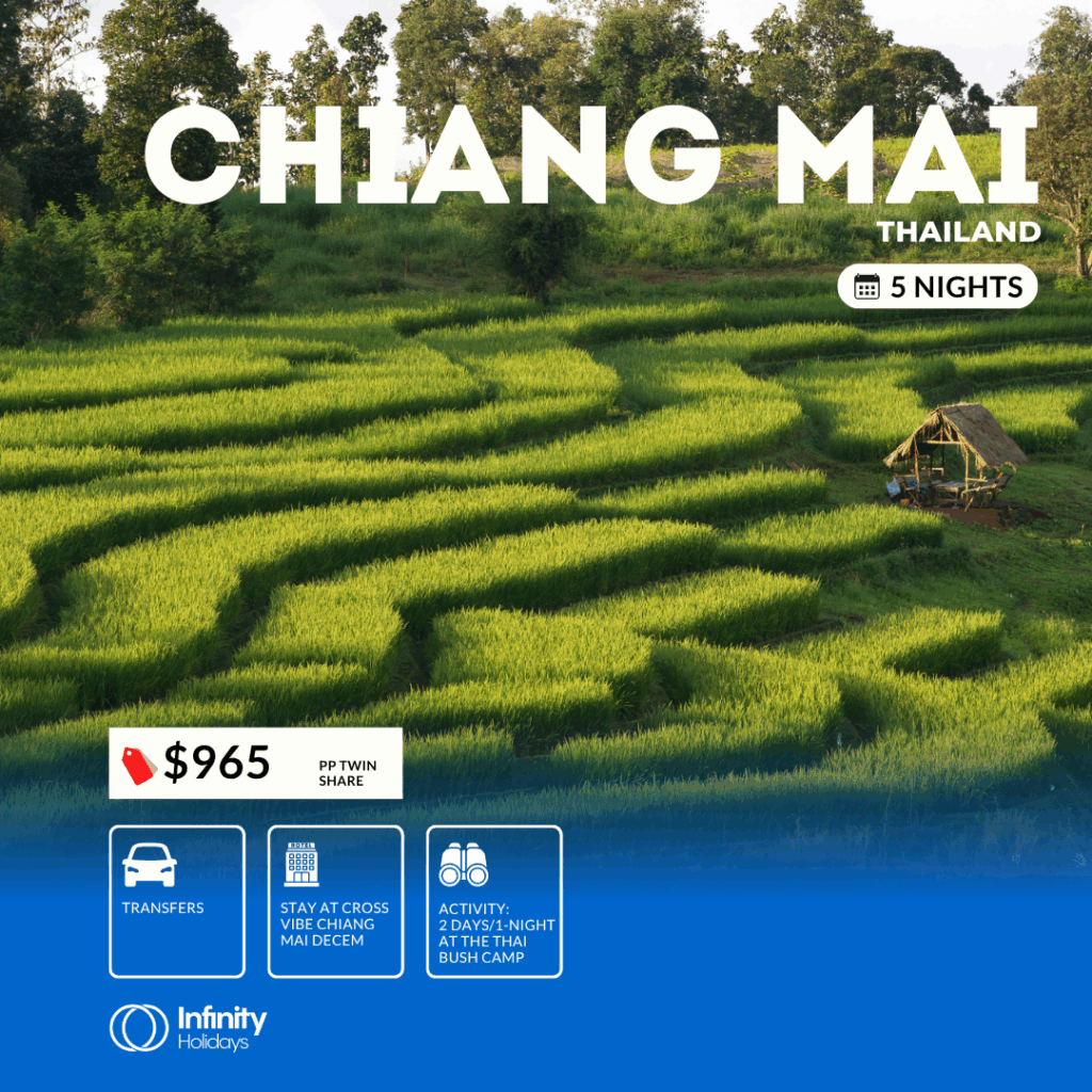 4 nights at Cross Vibe Chiang Mai Decem, 2 days/1 night at The Thai Bush Camp Experience, PLUS airport transfers.
