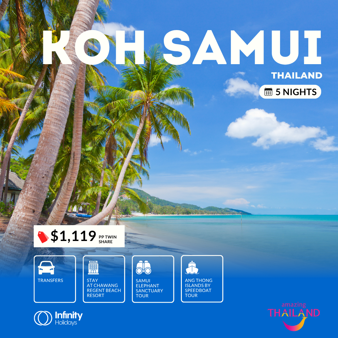 5 nights at Chaweng Regent Beach Resort, Samui Elephant Sanctuary Shared Tour, Ang Thong Islands by Speedboat Tour PLUS transfers.